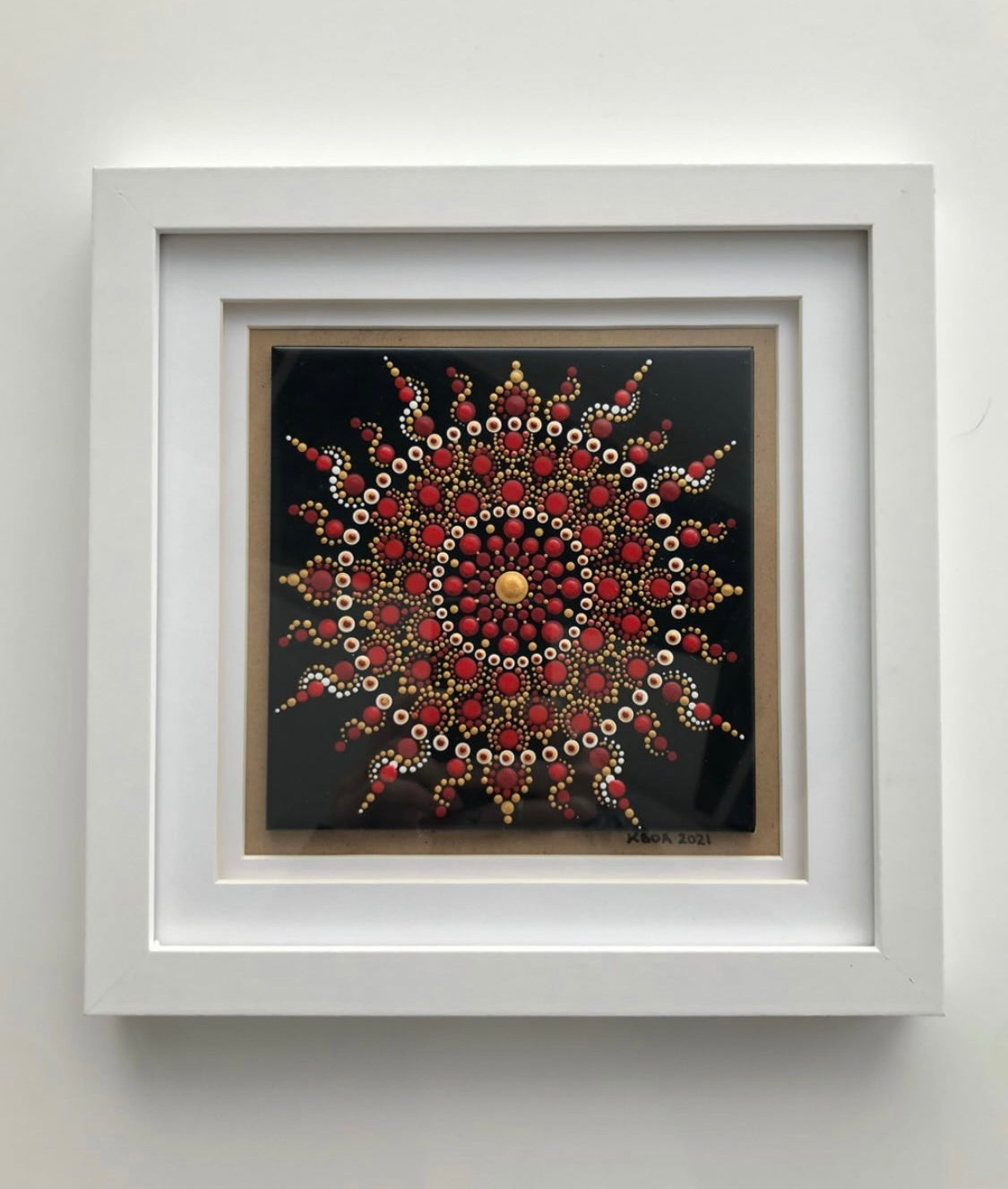 Painted in radiant mandala form, the sun is expressed through layered dots of red, gold, and white, emanating outward like rays of vitality and strength. For me, this work reflects my father’s spirit: a bright and steady light of inspiration and guidance. It is both personal and devotional—a reminder of gratitude, lineage, and the healing force of light.