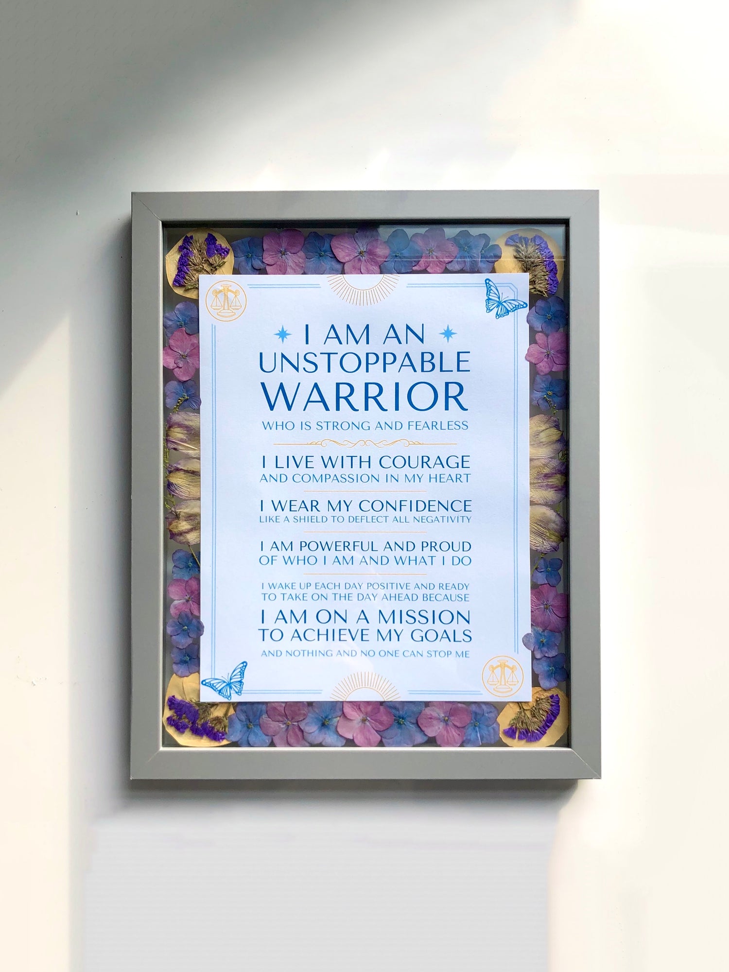 The design combines graphic elements with pressed flowers, creating a frame of natural colour and texture around the words. Each petal and hue was chosen to amplify the energy of the affirmation, turning it into a work of both beauty and empowerment. It is a reminder of inner power, meant to uplift and inspire each time it is read.
