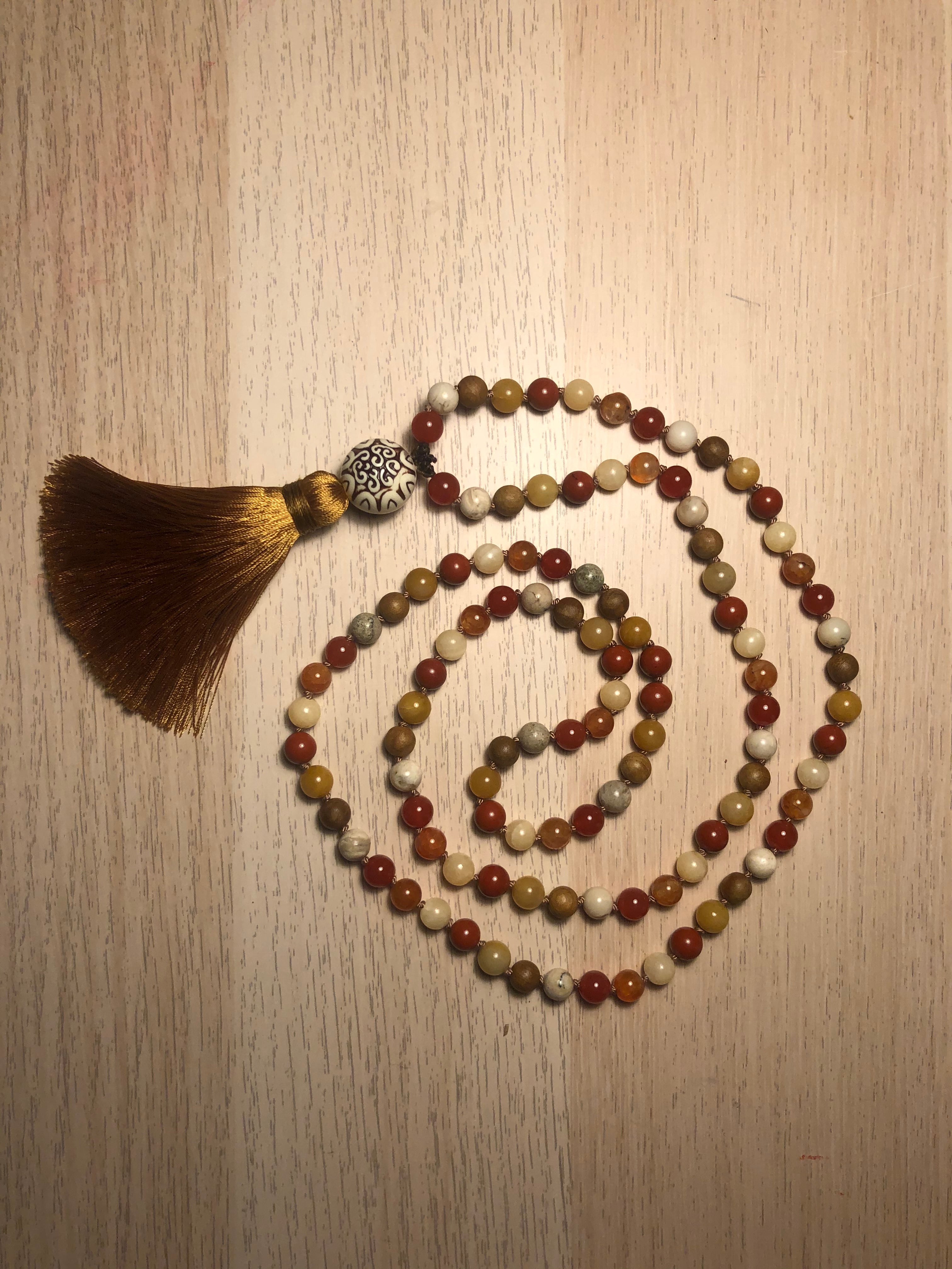 This mala was created for a friend walking a spiritual path rooted in Buddhist practice, where orange holds deep symbolic importance. The design draws on stones chosen for both their colour and their energy: carnelian and red jasper for vitality, courage, and grounding; yellow jade for wisdom and clarity; and sandalwood for its calming presence and sacred association with devotion.