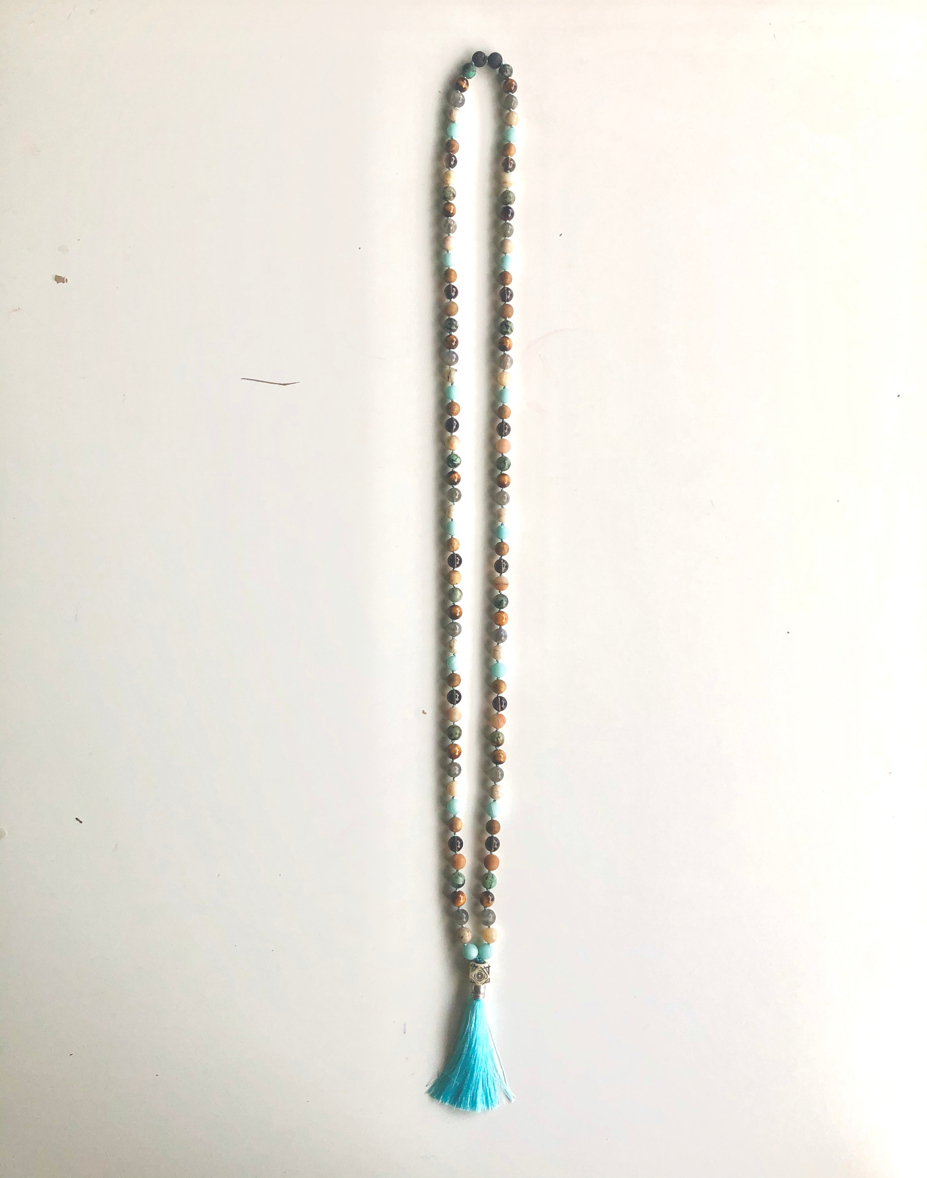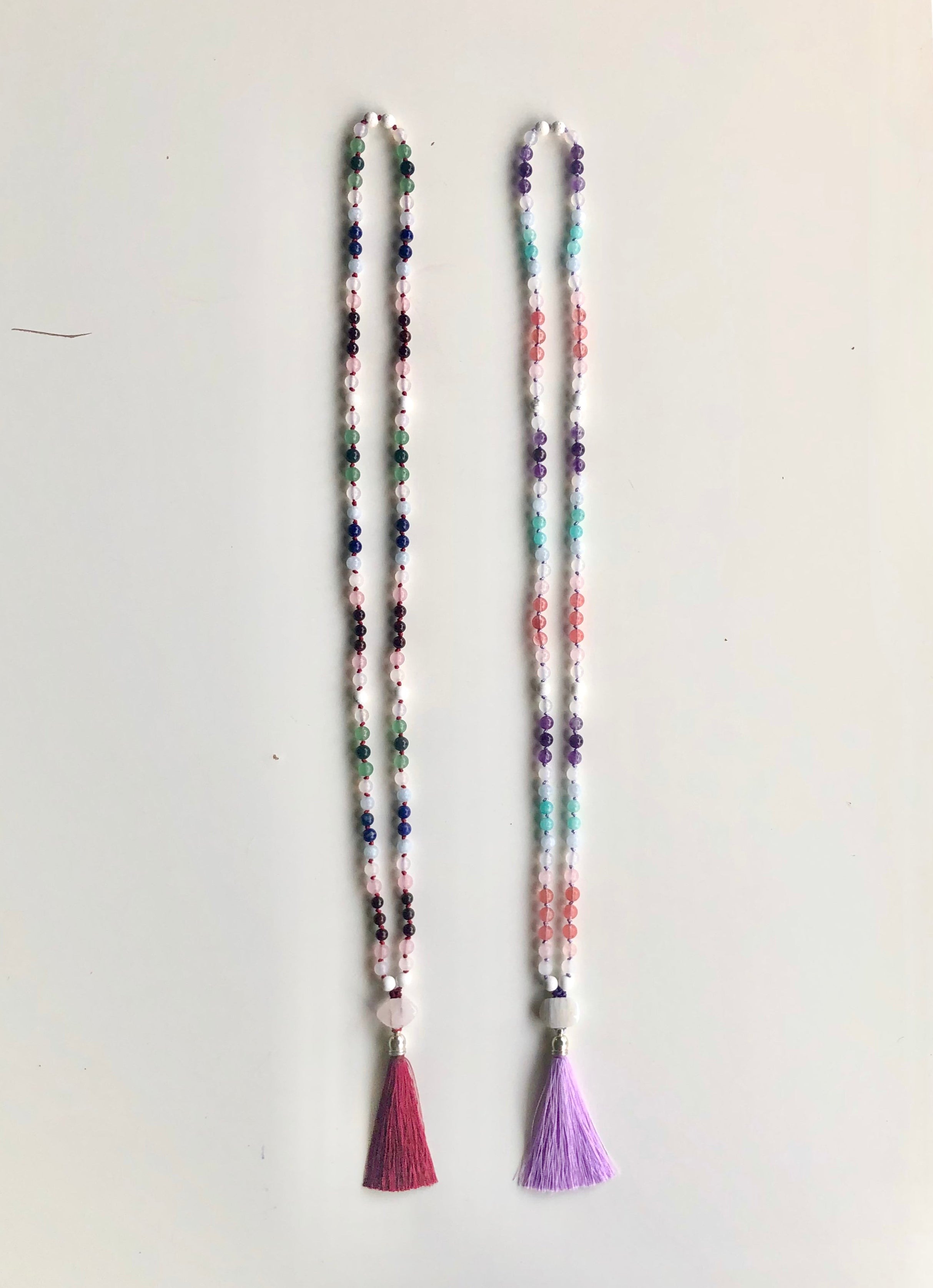 Each mala I create is designed with intention, built from a collection of real gemstones chosen to resonate with one another. The stones are selected not only for their beauty, but for the way their energies align—coming together to support a collective purpose. Every mala is meant to be both a tool for practice and a companion on the path, carrying the quiet strength of the materials it holds.