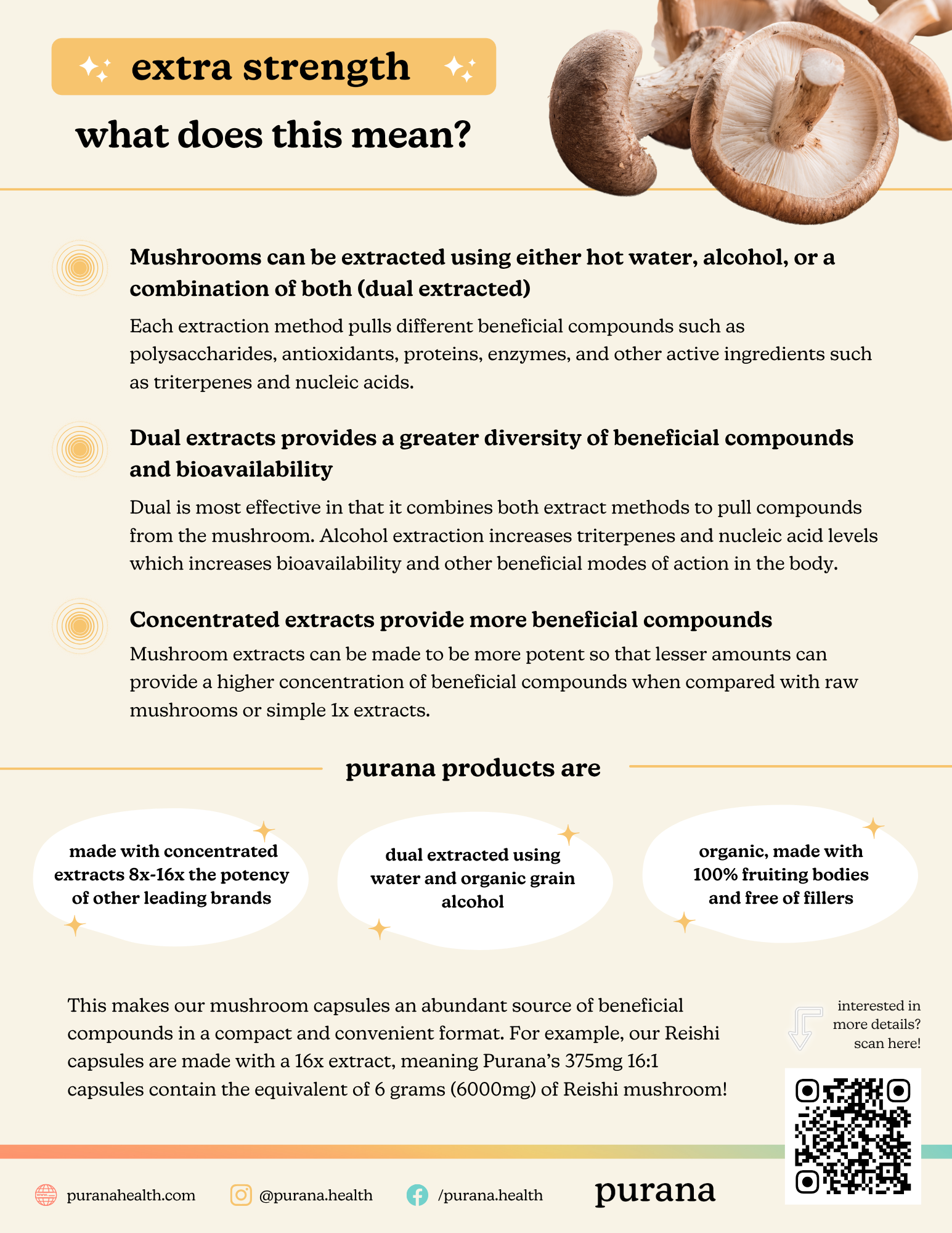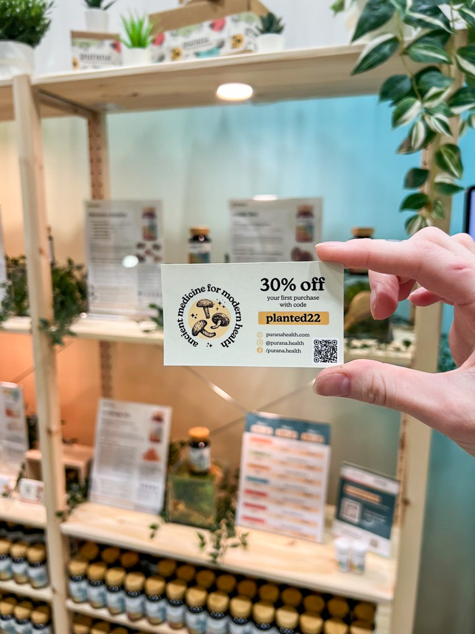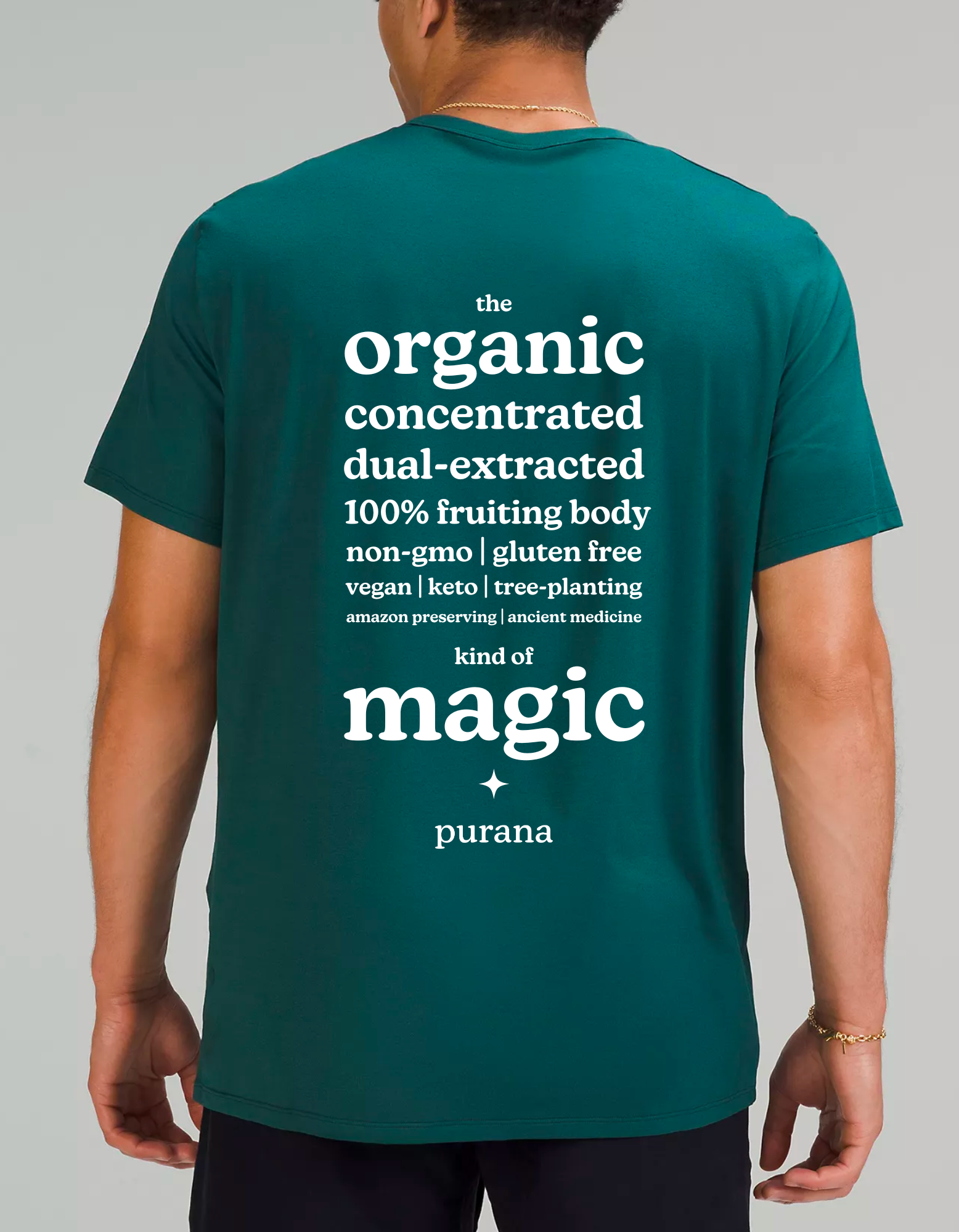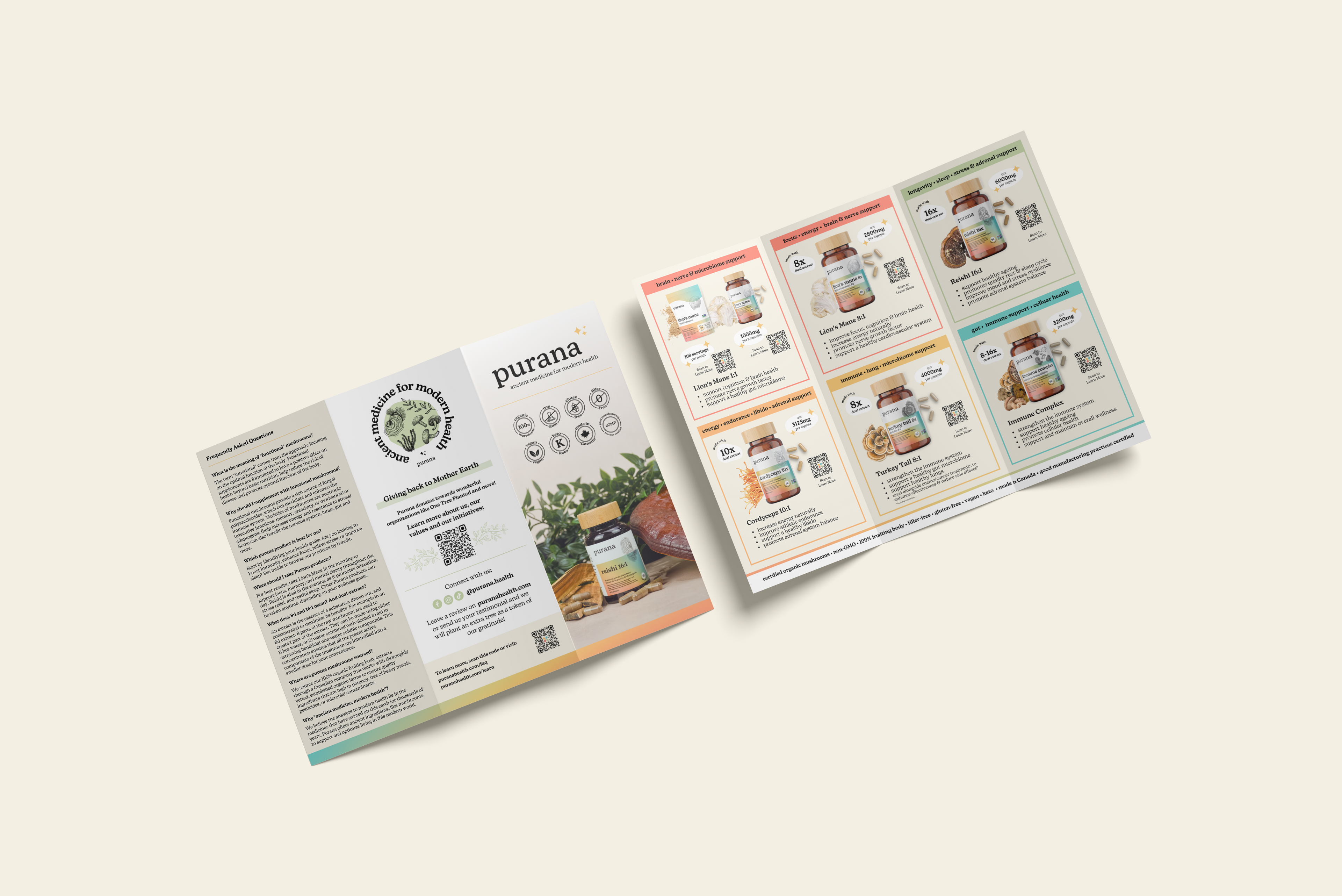 On the back, the true magic is revealed: organic, concentrated, dual-extracted, 100% fruiting body — the stuff that makes Purana powerful. The campaign was a hit at events and pop-ups, creating instant conversation.