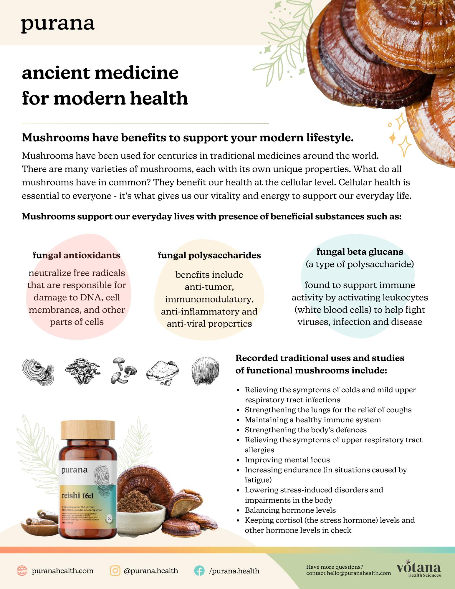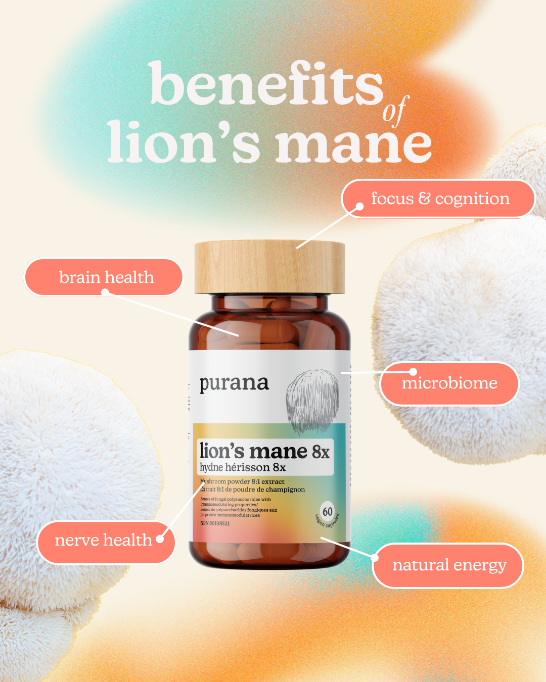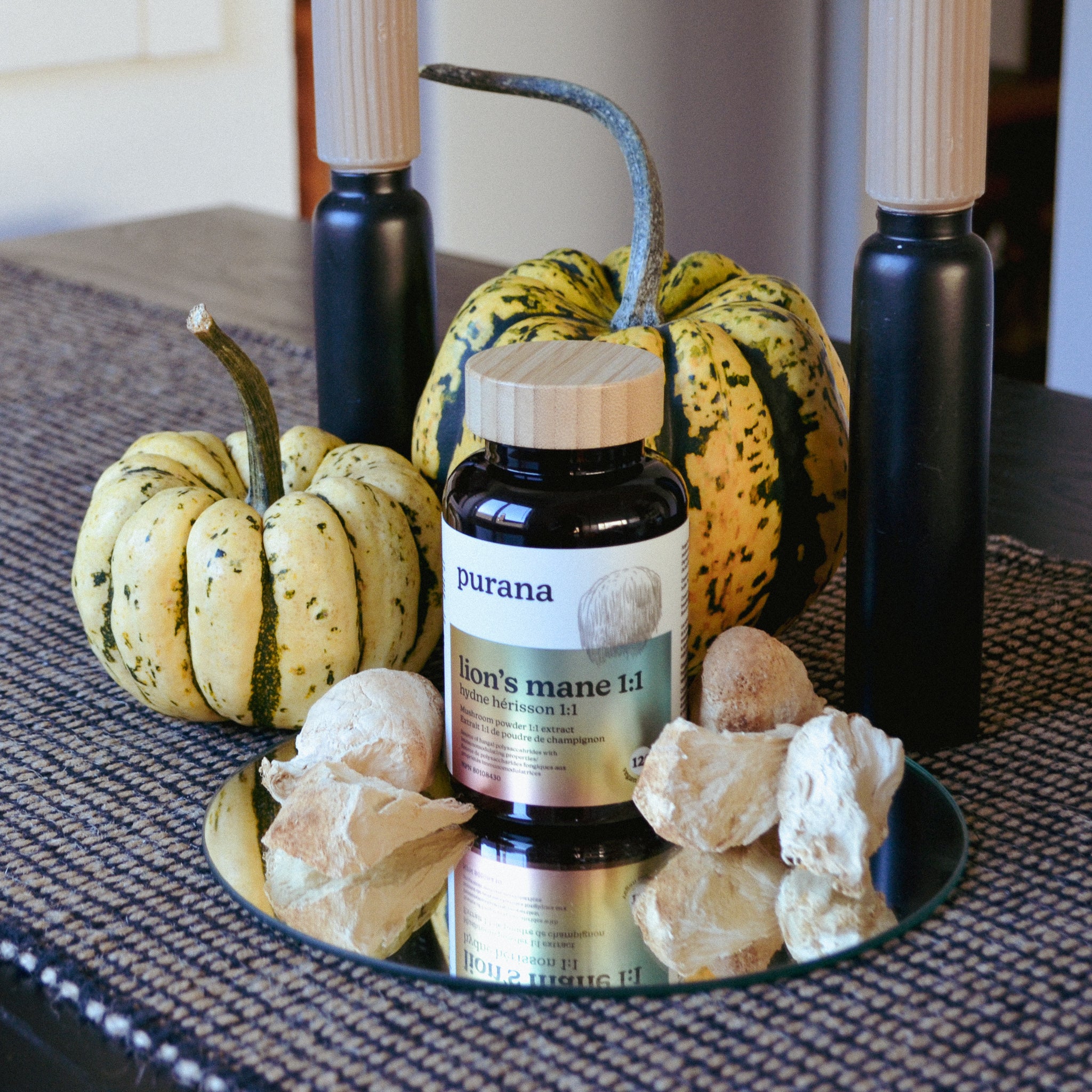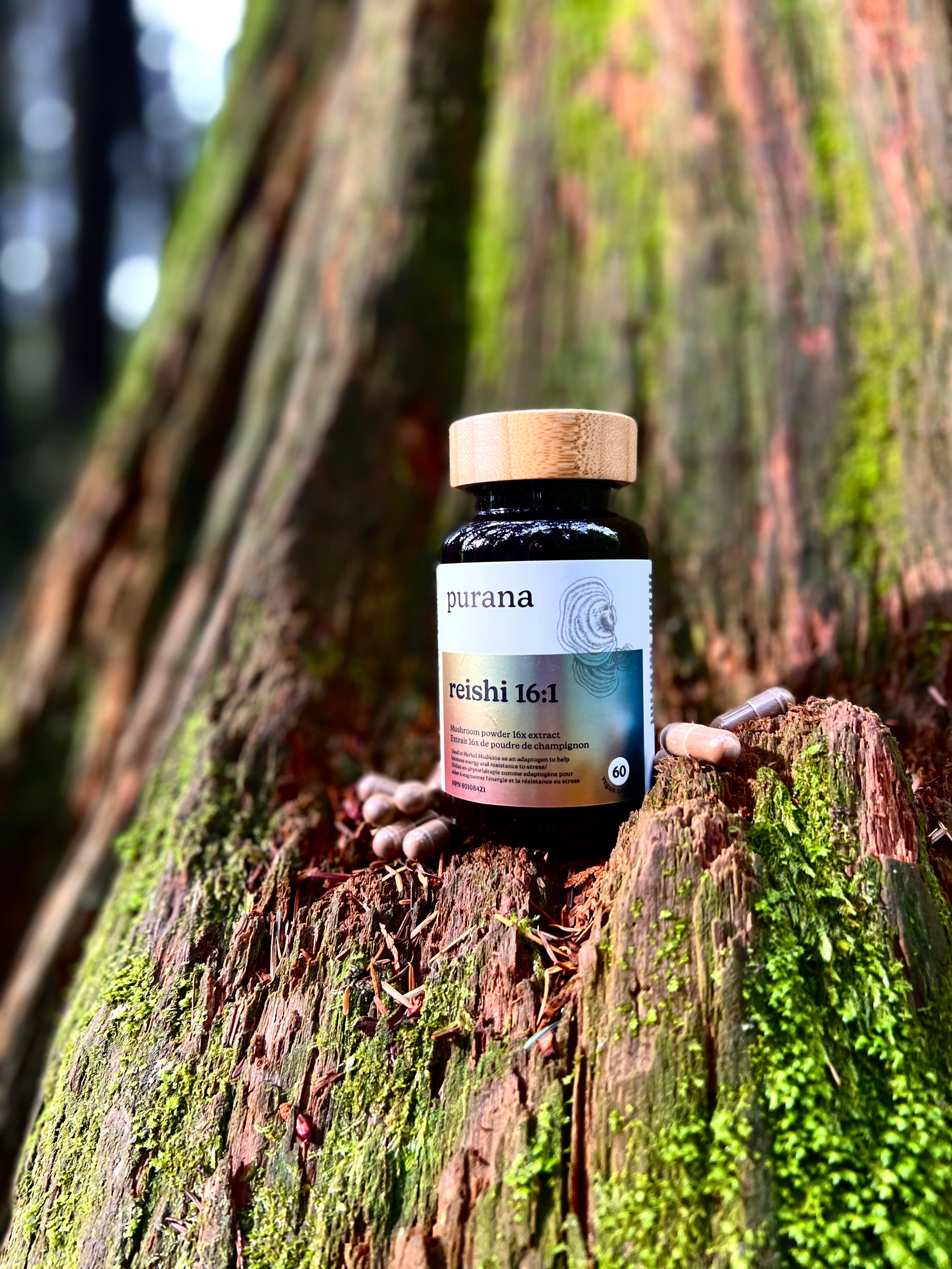 On the back, the true magic is revealed: organic, concentrated, dual-extracted, 100% fruiting body — the stuff that makes Purana powerful. The campaign was a hit at events and pop-ups, creating instant conversation.