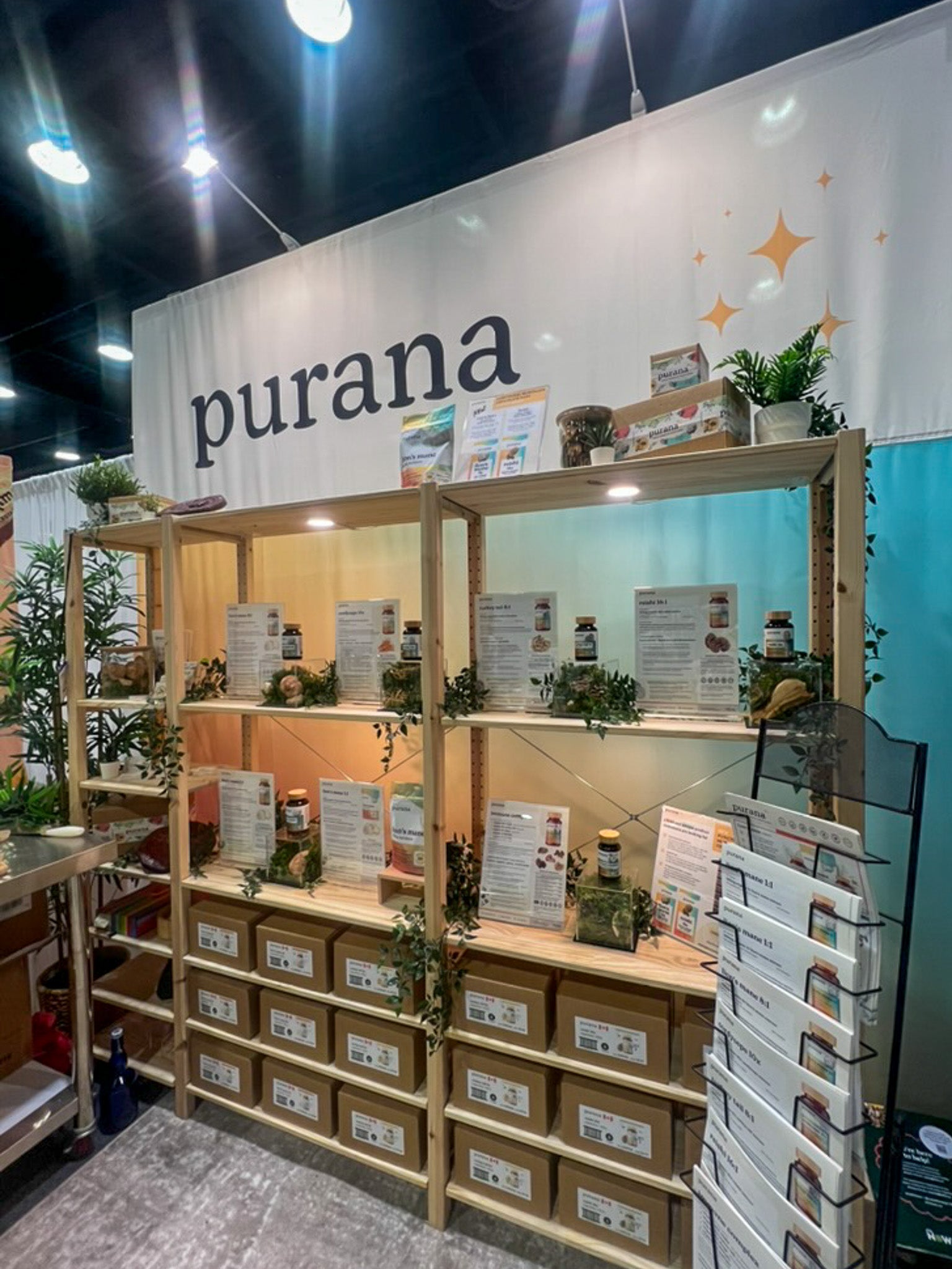 Event booths were styled as immersive brand spaces, featuring natural wood shelving, greenery, and a gradient backdrop that echoed Purana’s packaging palette. Informational product cards and cohesive signage created an inviting, educational environment that drew attendees in and encouraged meaningful conversations.