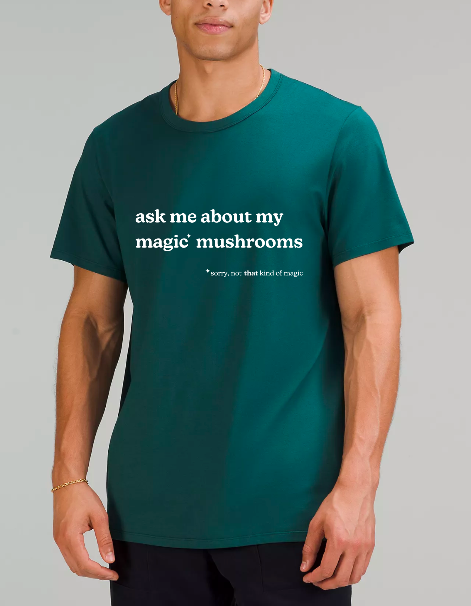 With playful copy and bold typography, we leaned into the double take. Shirts and signage read: “Ask me about my magic mushrooms” — followed by a wink: “Sorry, not that kind of magic.”