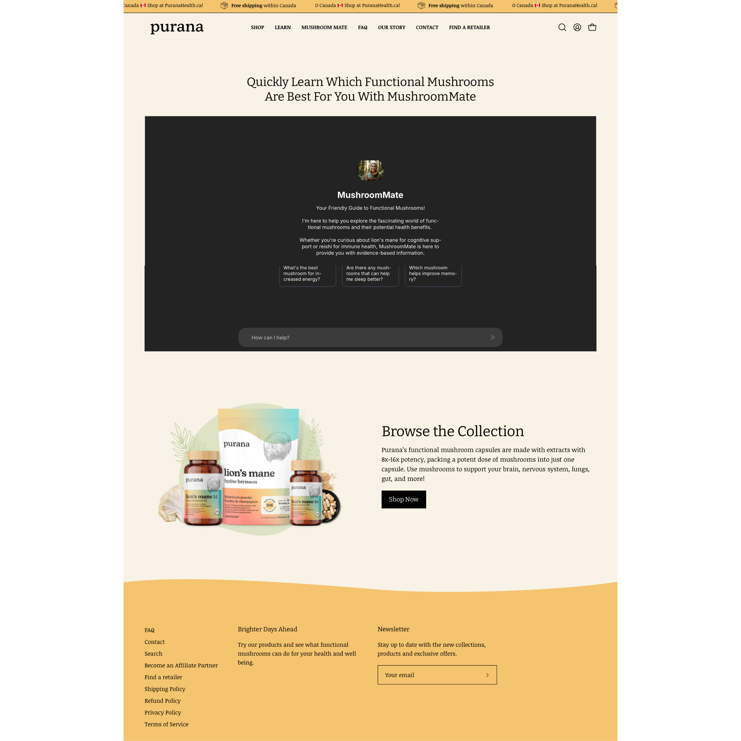 The Purana website was built on Shopify with a focus on clean navigation, intuitive product discovery, and a seamless checkout experience. Category organization, filters, and product pages were designed to help customers quickly find the right functional mushrooms while learning about their benefits.