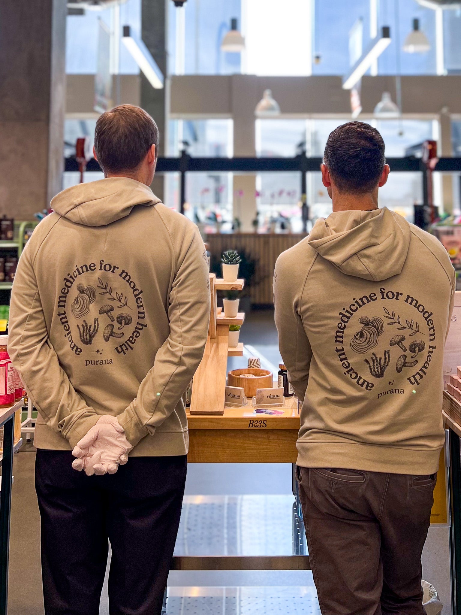 Custom-designed clothing featured Purana’s circular mushroom illustration and tagline,“Ancient medicine for modern health.” Worn by the team at demos and events, they served as both a uniform and a moving piece of brand storytelling. Often complimented pieces, they spark curiosity and reinforce the visual identity beyond packaging.