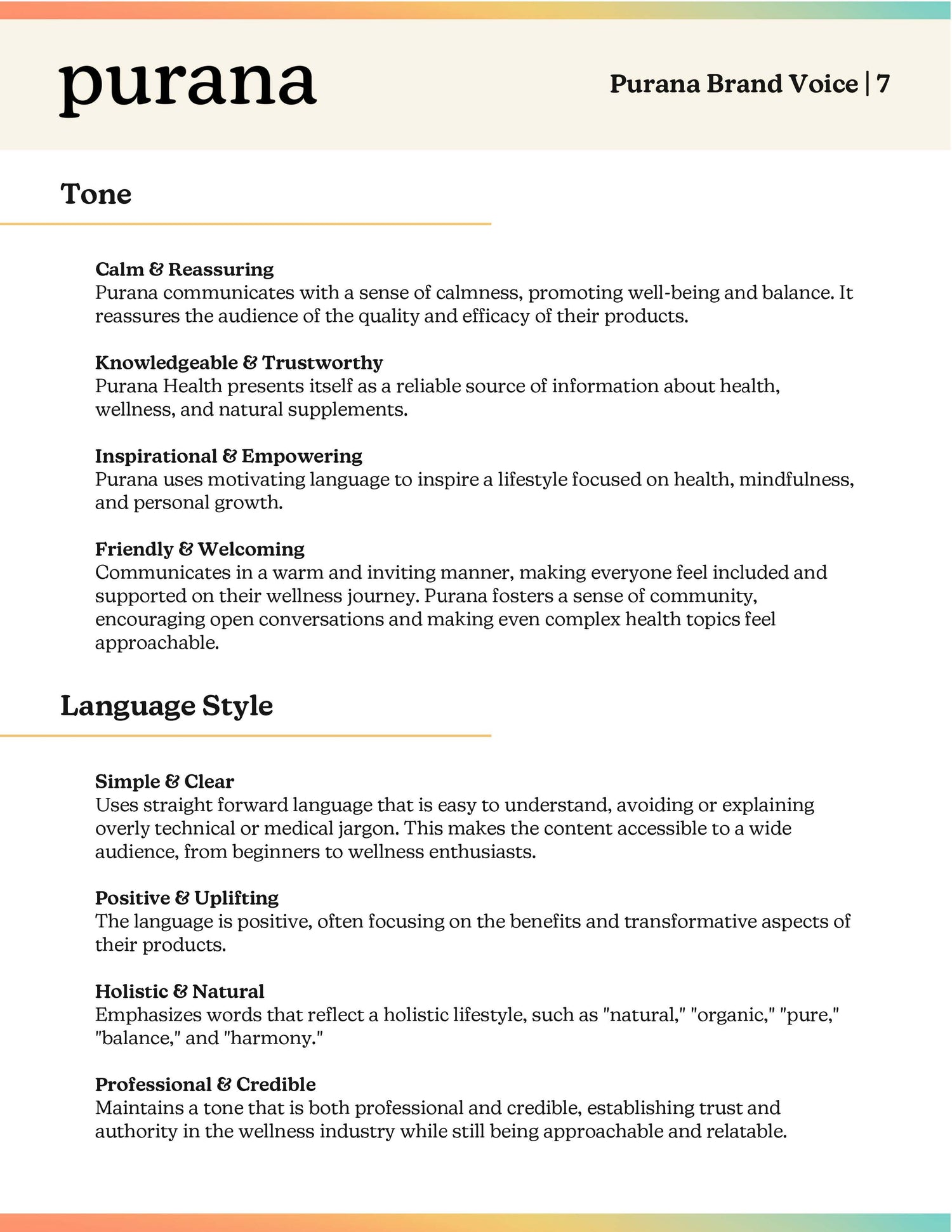 As Purana’s visual and verbal identity took shape, I created a detailed social media guide to help translate the brand consistently across platforms. This internal resource was built to empower future team members, creators, and collaborators to speak with the brand — not just about it.